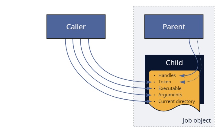 NtCreateUserProcess, can even narrow it down to a subset of entries. Keep in mind that copying only applies to handles already marked as inheritable. Although it is easy for a process to temporarily change the inheritance mode for any of its handles viaNtSetInformationObject, it might not be so trivial to achieve during re-parenting. - Job object, or the lack of one. Depending on the limitations configured on the parent’s job, this feature might be either advantageous or unfavorable. Sometimes, the caller can request to break away the child from the job, which requires a special flag or system-level permissions. Alternatively, the caller can also put the child into more jobs — directly during creation with