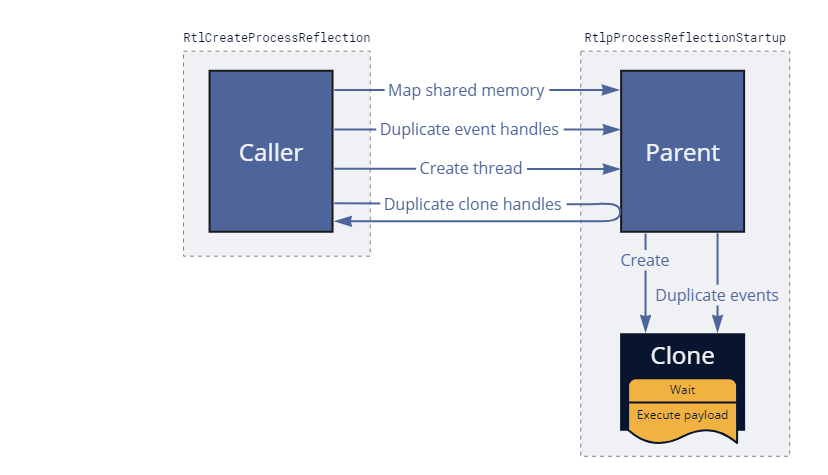 RtlpProcessReflectionStartupfunction and waits until this thread either exits or notifies us that the clone has started. - It duplicates the process and thread handles of the clone from the parent into the caller and exits.