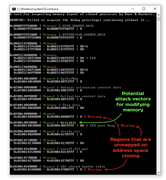 We present a small tool shown in the screenshot above to help identify problematic regions both in terms of potential for exploitation and troubleshooting access violations. It clones a process of your choice and then compares the address space layouts, highlighting the differences. As always, you can find the source code and the binary in the dedicated sections of the repository.
