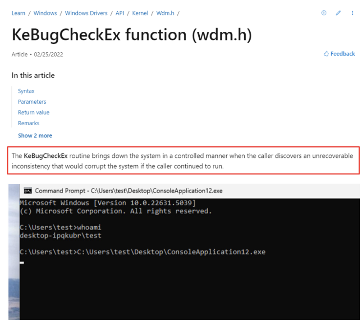 When the POC is executed, the nt!KeBugCheckEx function is called and the system enters an unrecoverable state.