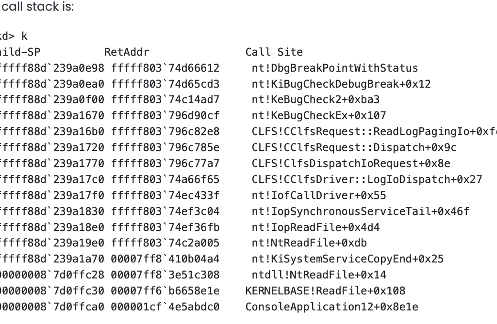 This vulnerability is caused by CWE‑159: Improper Handling of Invalid Use of Special Elements, which leads to an unrecoverable inconsistency in the CLFS.sys driver. This condition forces a call to the KeBugCheckEx function, allowing an unprivileged user to trigger a system crash. This document uses CLFS.sys version 10.0.22621.5037 as an example. Microsoft silently fixed this vulnerability in the September 2025 cumulative update for Windows 11 2024 LTSC and Windows Server 2025. Windows 25H2 (released in September) was released with the patch. Windows 1123h2 and earlier versions remain vulnerable.