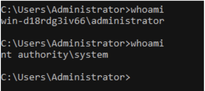 After continuing execution, we can see our cmd.exe process has elevated to “NT AUTHORITY\SYSTEM”.