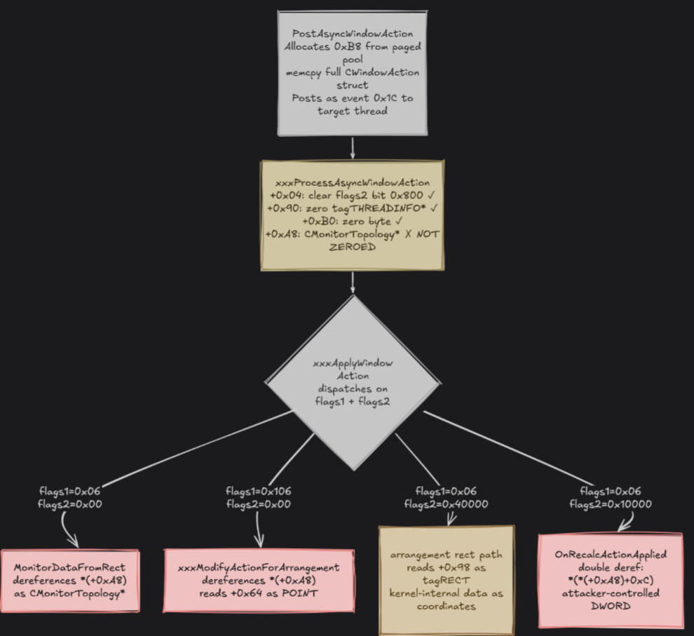 CVE-2026-20811 is a type confusion caused by incomplete sanitization of an internal kernel buffer passed through the Win32k async message queue. The CMonitorTopology* at offset +0xA8 of a 0xB8-byte CWindowAction buffer survives sanitization in xxxProcessAsyncWindowAction and is dereferenced by xxxApplyWindowAction on the receiving thread.