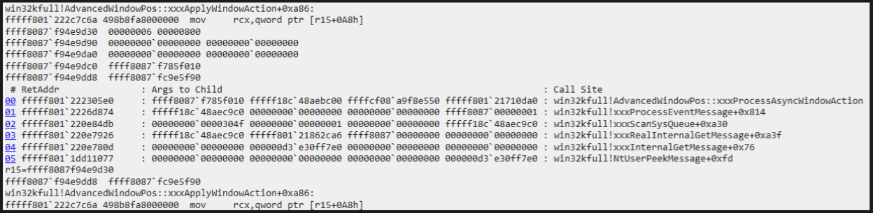 The CWindowAction struct at this point contains kernel pointers that were populated during processing on the caller’s thread.