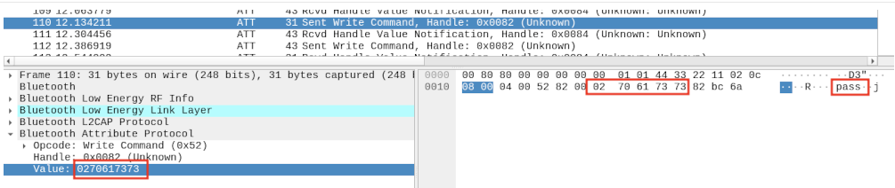 0x01. - APP sends a buffer of 5 bytes to the device, starting with a byte set to 0x02 and followed by ASCII characters that read “pass”.