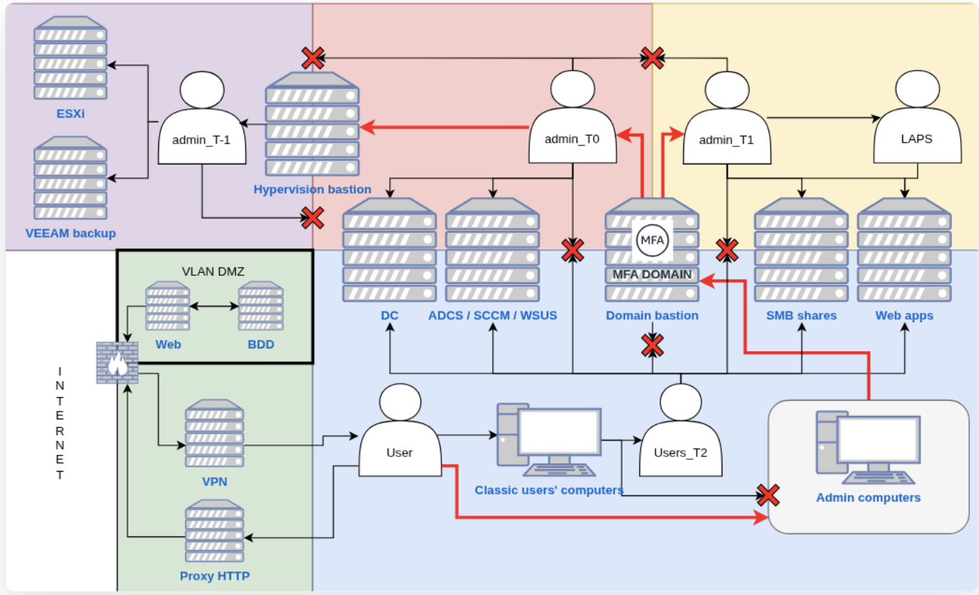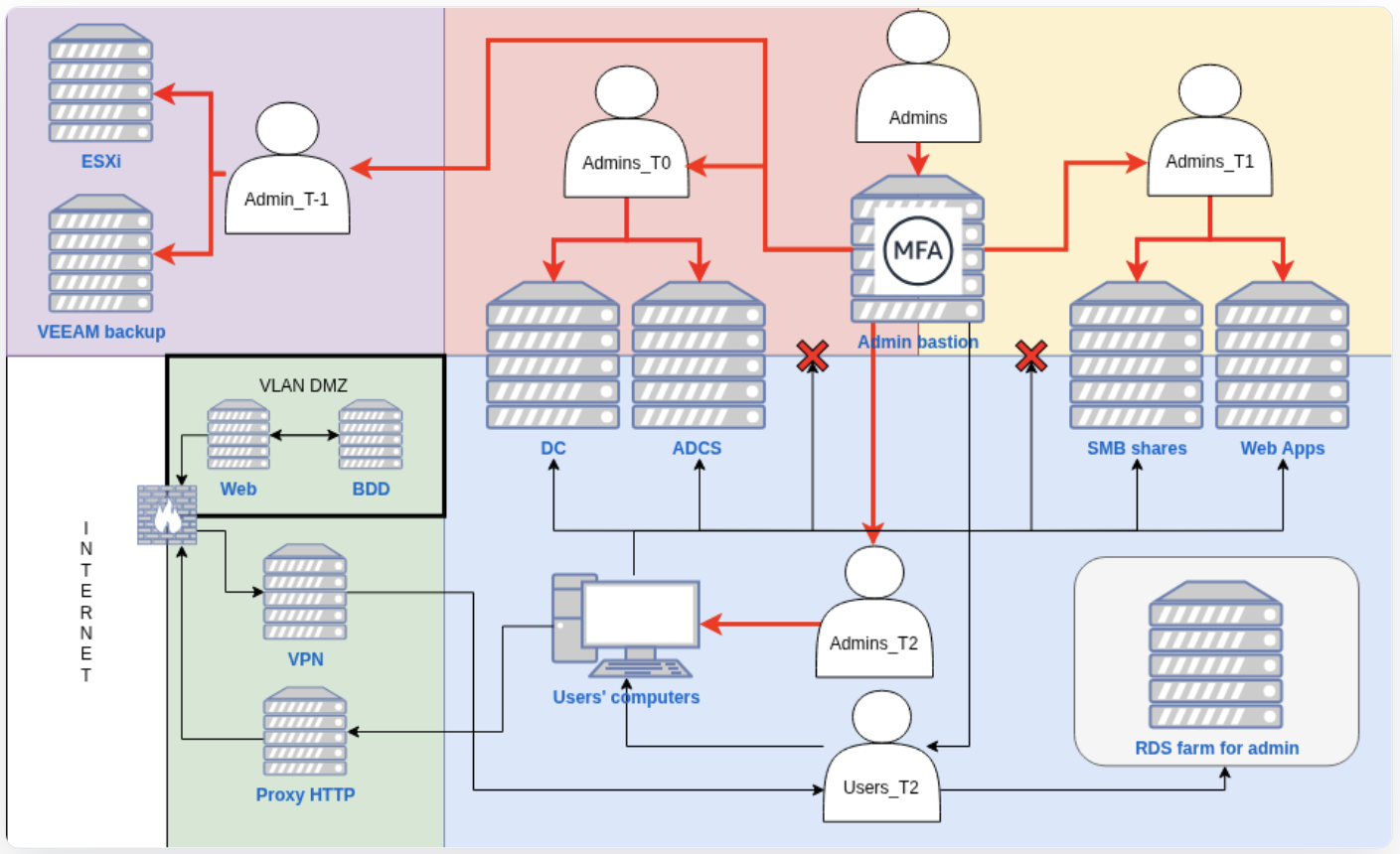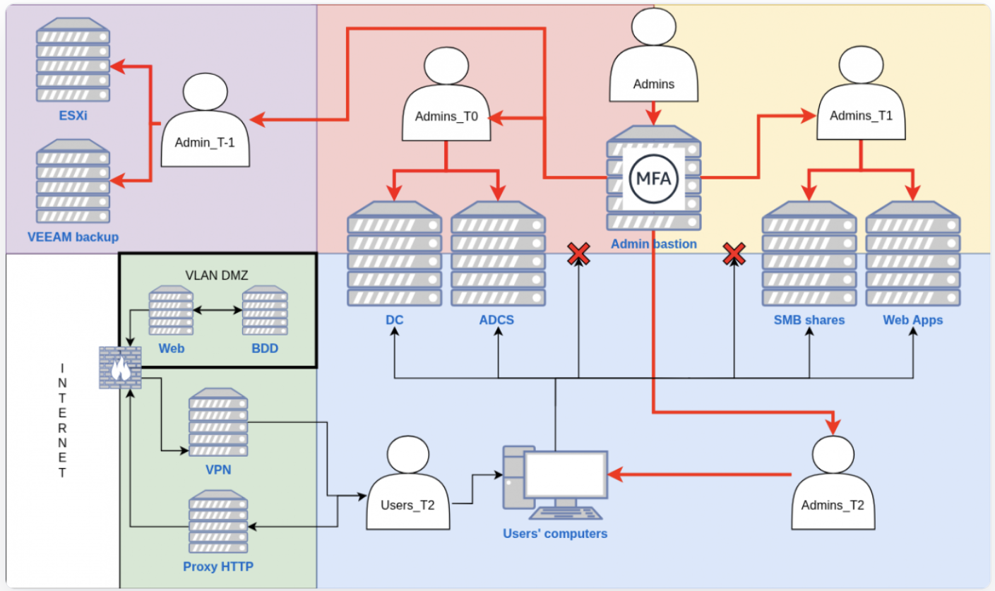 - Tier 0: Domain admins, privileged accounts, groups and containers, management servers (ADCS) and backups / hypervisors infrastructures