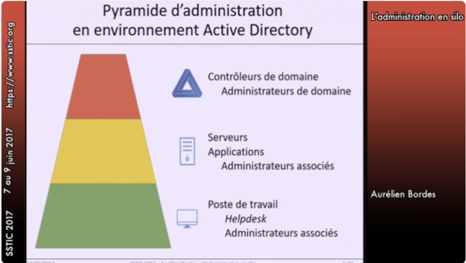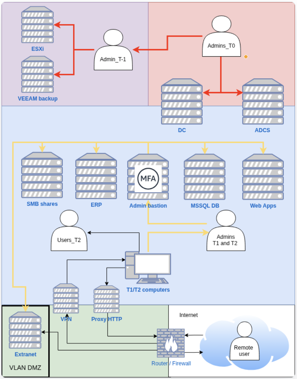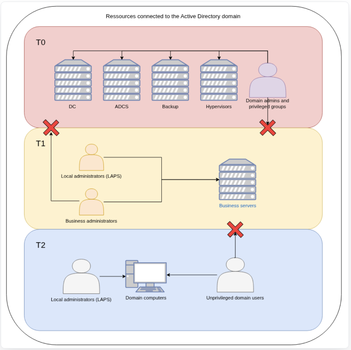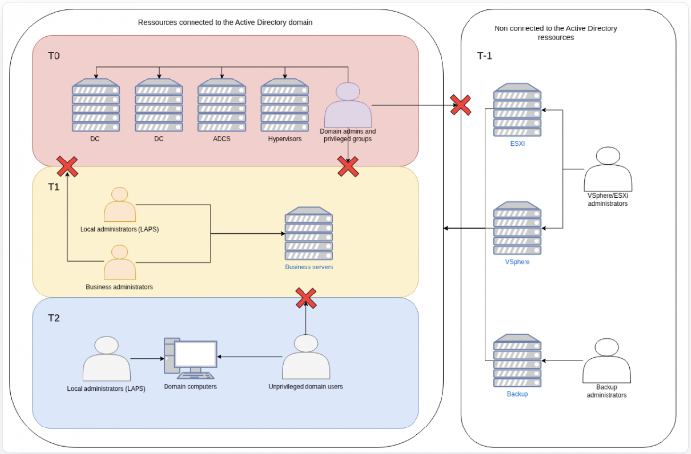 - Tier 0: Domain admins, privileged accounts, groups and containers, management servers (ADCS) and backups / hypervisors infrastructures