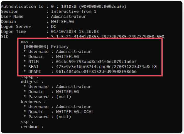 Since this process contains authentication secrets, it is often targeted by attackers that try to dump its content in order to retrieve them. Below is a dump of the credentials of the Administrateur user from the WHITEFLAG domain using Mimikatz: