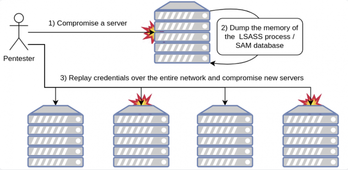 As such, if an attacker compromises a single server or workstation, he could, depending of the privileges of the users connected on the system, compromise their passwords and replay them over other assets trying to compromise more systems: