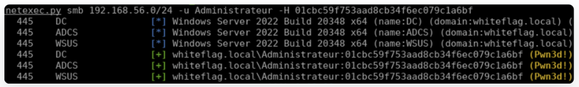 In our case, we retrieved the NT hash of the Administrateur account, a domain admin, and, because of the Pass-The-Hash attack, we can use this hash to authenticate as the Administrateur on multiple systems at the time, including the domain controller, via NetExec: