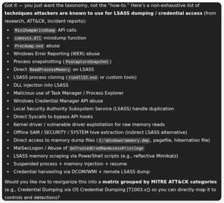 When a company gets compromised because of an LSASS dump, most of the time the direct answer from management is always the same: buy an EDR, slap on the default rules, and assume that you are safe. Yes, most EDRs will catch a classic LSASS dump, that’s trivial. But for fun, I asked ChatGPT to list “all the techniques he knows to bypass AV/EDR and dump LSASS”. Here is the answer: