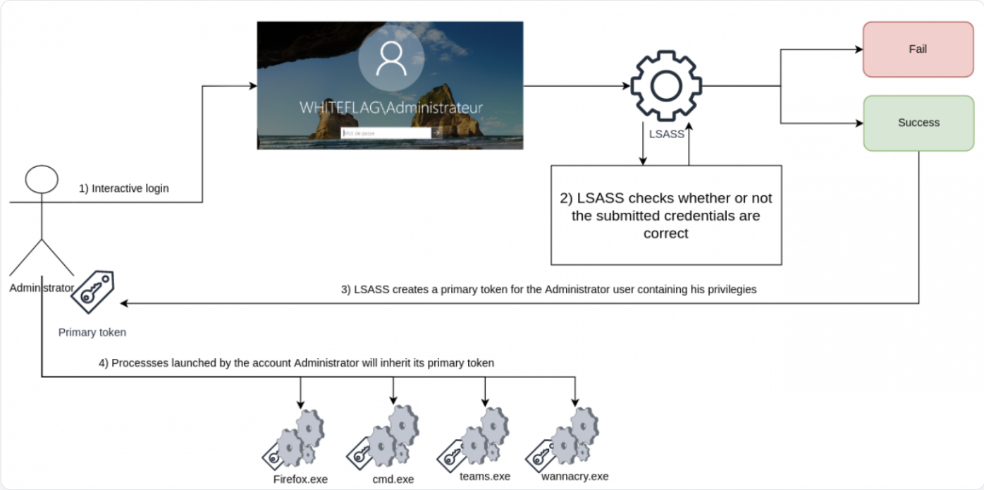 And that’s what Luke Jennings did in 2014 when he developed the Access Token impersonation attack. As Luke described, when a user authenticates on Windows, their password (clear text or NT hash) is validated and stored inside LSASS’s memory. At the same time the system creates a structure called a primary token that holds information about the user such as its name, its SID, its group memberships and, most importantly, its privileges: