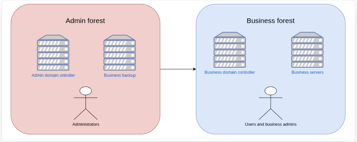 I have one last one, the “final boss” of tiering architectures that relies on a dual-forest setup, each hosted on its own isolated network: one for administration and one for business operations.