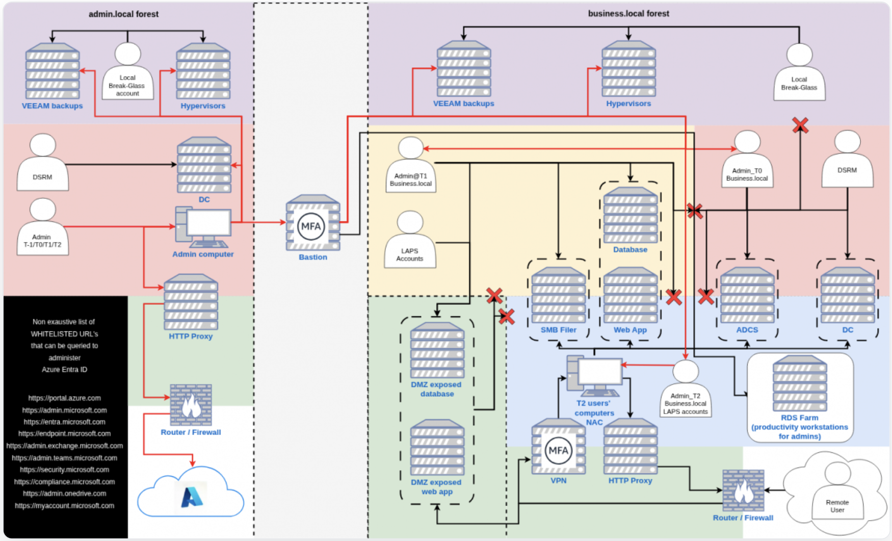 Finally, since privilege flows downward and admin’s computers cannot access Internet beside EntraID endpoints, there is practically no way an attacker could get access to even an admin in the admin forest. As such, privileged users are effectively safe.