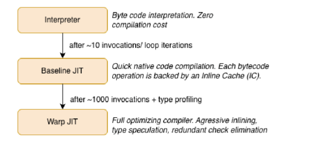Like all modern JS engines, SpiderMonkey uses a multi-tier architecture to balance startup latency against peak throughput. JavaScript code progresses through increasingly optimized execution tiers as it gets hotter: