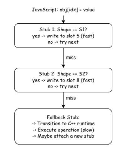 SpiderMonkey’s Baseline JIT implements ICs as a stub chain, a linked list of small machine code fragments, each specialized for a particular object shape: