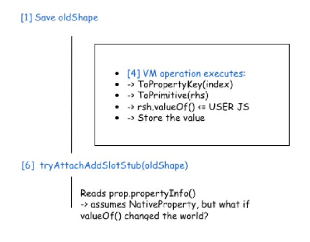 The gap between [1] (saving oldShape) and [6] (attaching the stub) is the attack surface. During step [4], the VM operation can invoke user-controlled JavaScript. If that JavaScript mutates the object or its backing storage in unexpected ways, the assumptions that tryAttachAddSlotStub relies on is “a native property was just added to this object” may no longer hold.