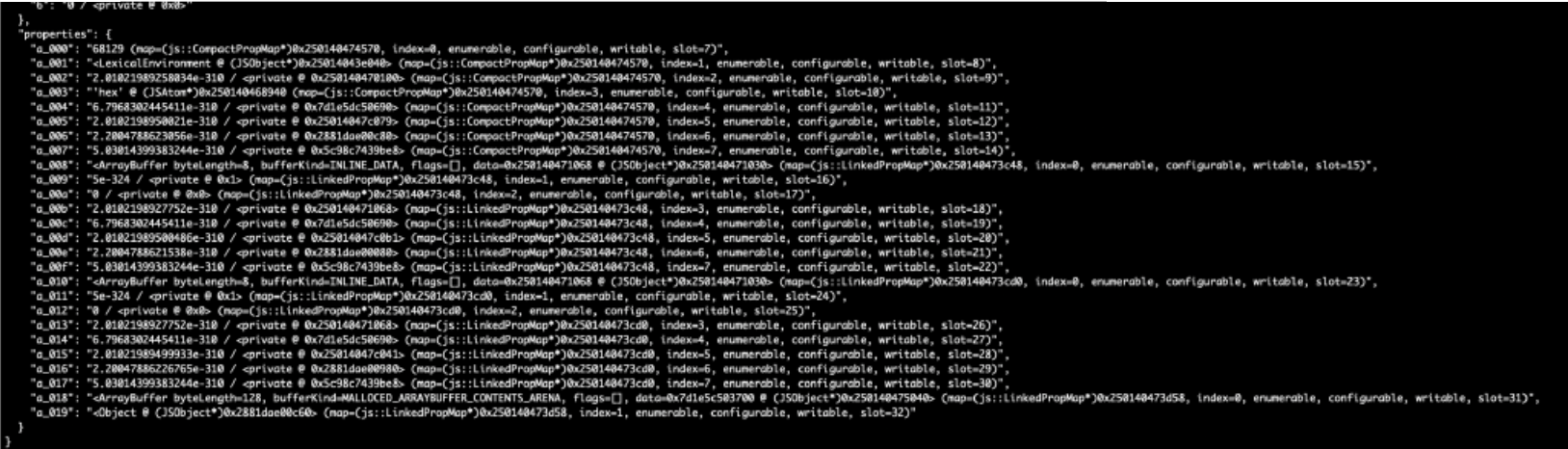 The exploit constructs a fake Uint32Array object inside an ArrayBuffer’s inline data region: