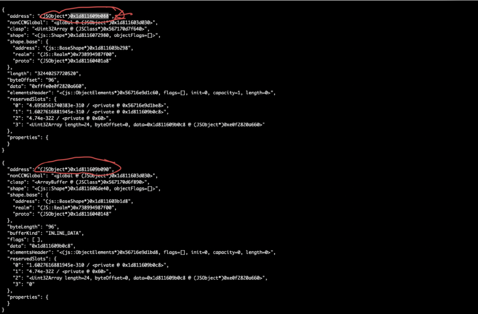 The second spray allocates 208 ArrayBuffer(0x60) objects. Since each ArrayBuffer is 96 bytes with INLINE_DATA, the buffer contents are stored directly in the object’s fixed slots, placing spray data inside the GC heap at predictable offsets from the leaked addresses.