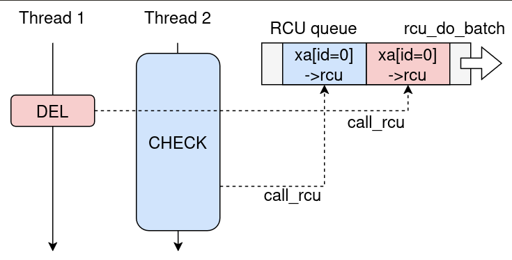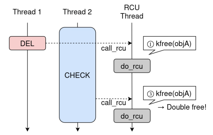 If CHECK_ENTRY is still hashing user memory while a racing DEL_ENTRY removes the same entry, both paths can enqueue the same rcu_head: