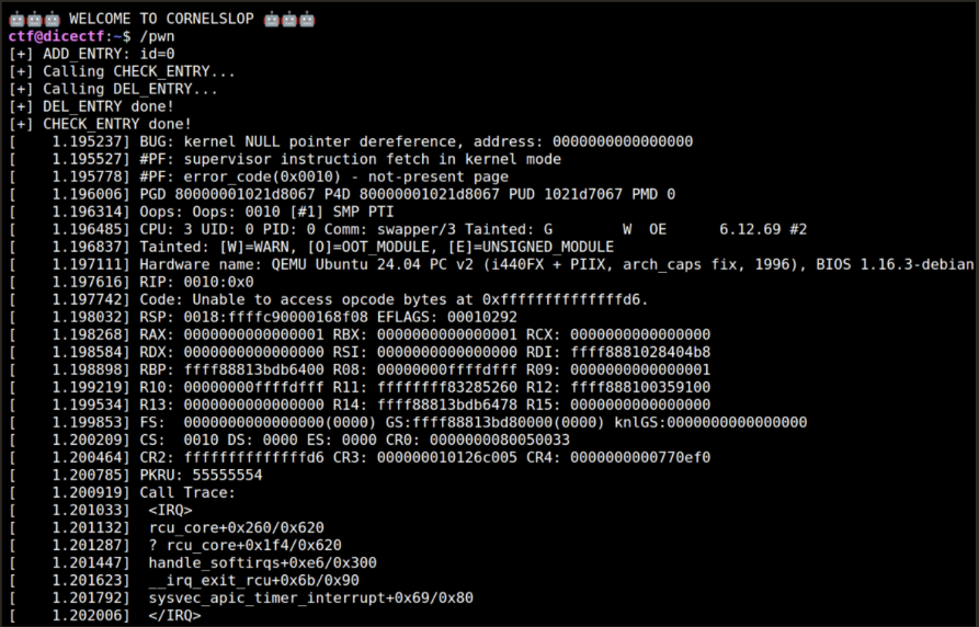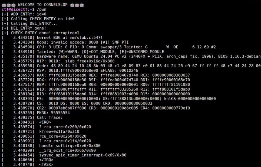 The article is a detailed write-up of the “cornelslop” Linux kernel exploitation challenge from DiceCTF 2026. It explains how a race condition in a kernel module leads to a double free vulnerability involving RCU callbacks. The module manages entries stored in an XArray and exposes several IOCTL operations for adding, checking, and deleting objects. The vulnerability arises because two code paths (CHECK_ENTRY and DEL_ENTRY) can both schedule the same object for destruction using call_rcu() without verifying whether it was already removed, creating a race condition that results in a double free.