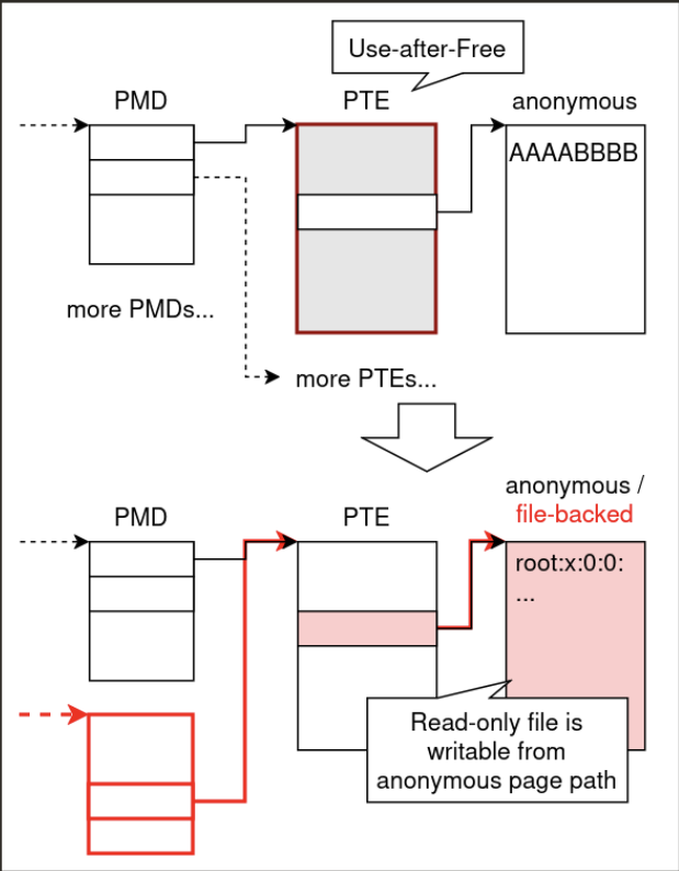 The final exploit overlaps page table entries (PTEs) from anonymous and file-backed mappings, allowing modification of read-only file mappings and ultimately achieving privilege escalation by overwriting system binaries.