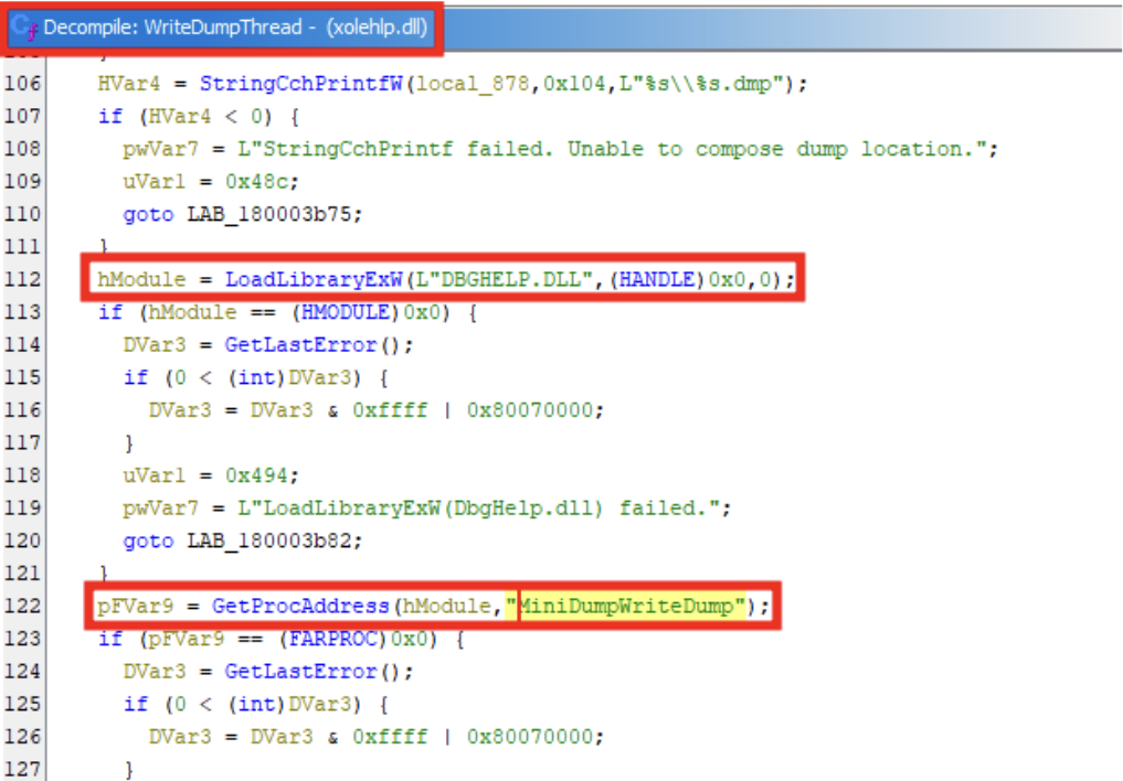 I had to go through the entire list to find a candidate of real interest. The screenshot below shows the API MiniDumpWriteDump being dynamically imported by the internal function WriteDumpThreadof xolehlp.dll.