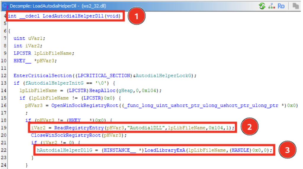 To put it simple, whenever the WinSock2 API is used, the DLL referenced in the AutodialDLL value is loaded. This setting defaults to rasadhlp.dll, but if we edit this value in the registry, we can theoretically load an arbitrary DLL into a process that uses this API. In practice, this “Autodial” DLL is loaded by the internal function LoadAutodialHelperDll, as illustrated below.