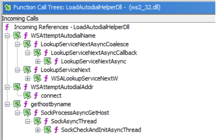 LoadAutodialHelperDllA closer analysis led to the discovery of the following potential entry points. By that I mean functions that are exported by ws2_32.dll, and are therefore susceptible to be called by other modules or applications.