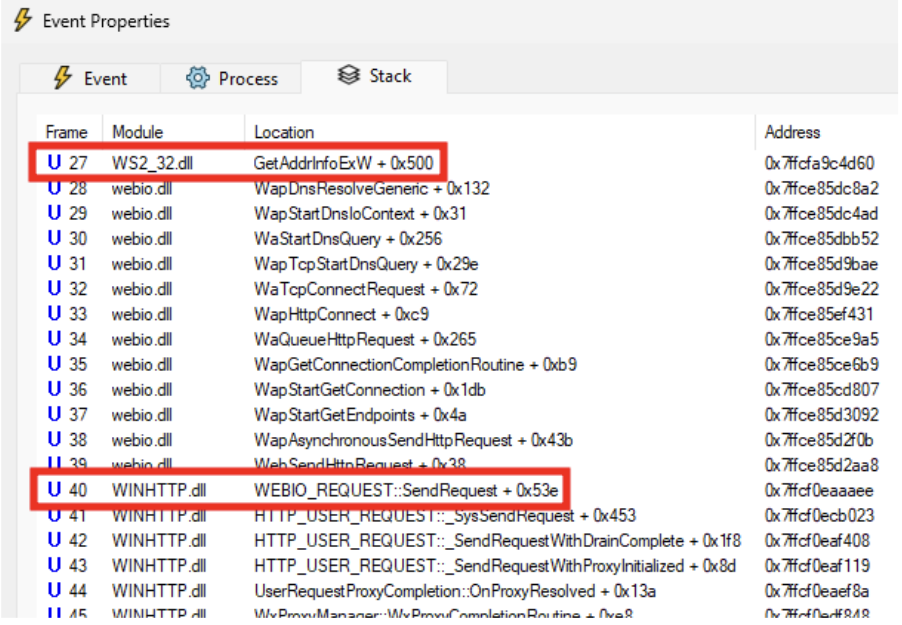 RegQueryValueExAHowever, by inspecting previous events, I noticed that this event originated from a call to GetAddrInfoExW, which is one of the functions exported by ws2_32.dll I identified previously. The call itself is the consequence of an HTTP request sent by LSASS.