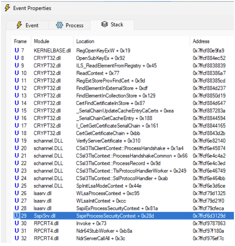 SspirProcessSecurityContextAt first glance, the reason why this procedure would cause an HTTP request to be sent is not obvious. Fast forward, after further analysis, I found that this occurs when calling AcquireCredentialsHandleA, followed by InitializeSecurityContextA, and using the Schannel Security Service Provider with the flag SCH_CRED_REVOCATION_CHECK_CHAIN.
