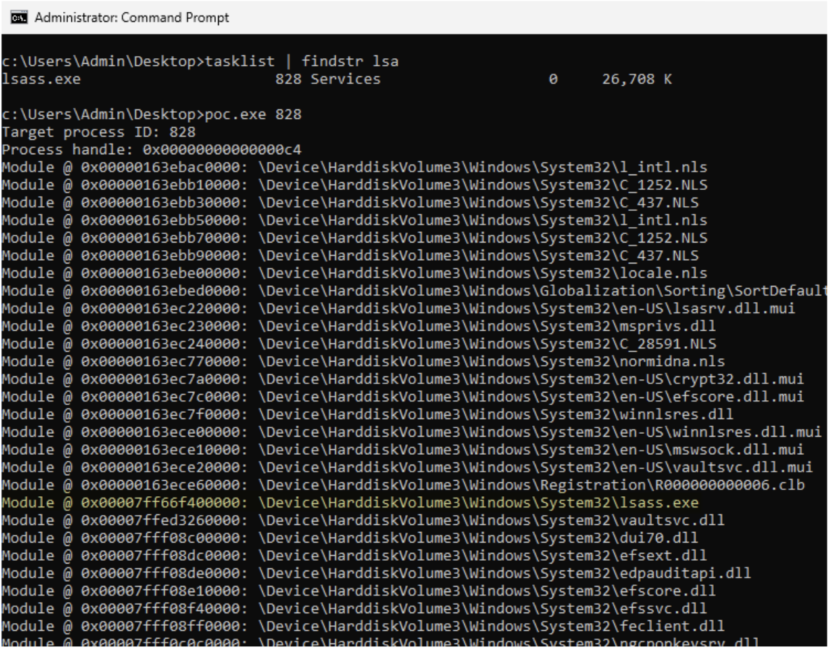 Thanks to the Autodial feature of the WinSock2 API, and the SSPI, I now have a way to load an arbitrary DLL into LSASS. However, I also mentioned that it is not 100% reliable, so I also need a way to determine whether the module was actually loaded.