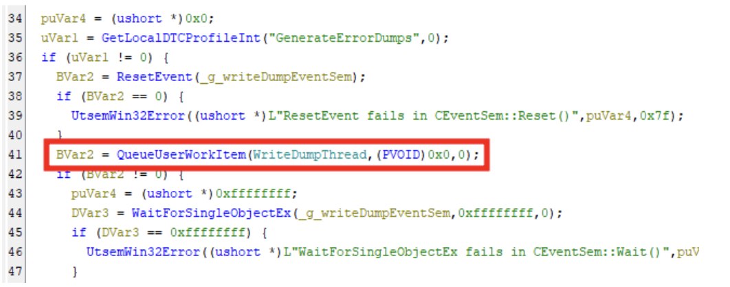 The function WriteDumpThread is executed through the well-known QueueUserWorkItem API, and the second parameter is set to NULL, which means that it doesn’t even care about its first (and unique) argument.