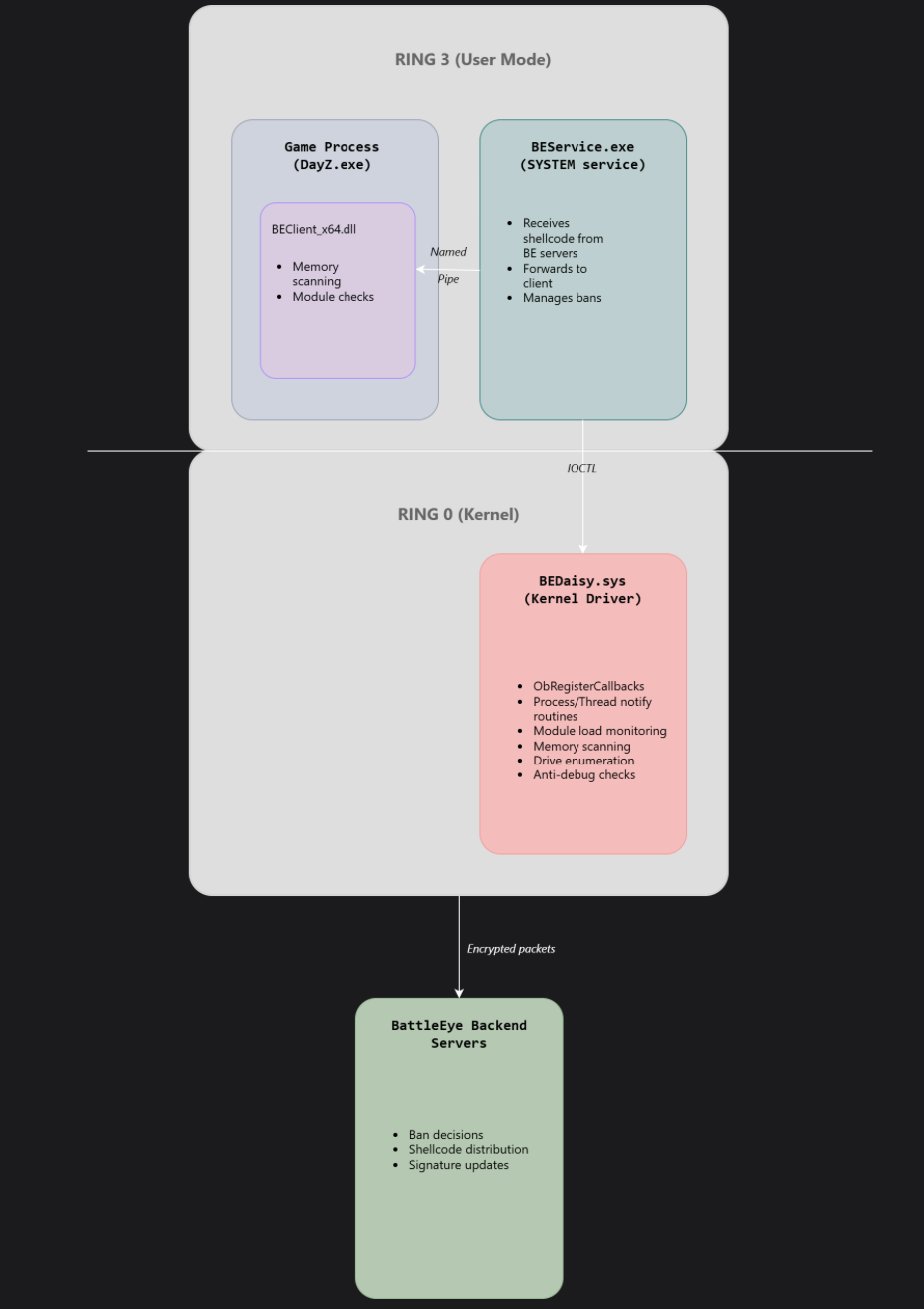 BattlEye’s architecture is well-documented through reverse engineering: