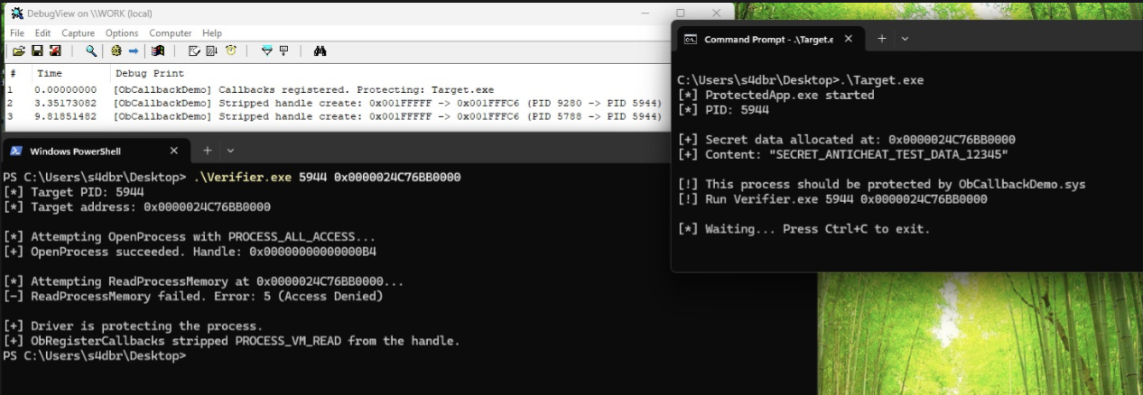When a cheat calls OpenProcess(PROCESS_VM_READ | PROCESS_VM_WRITE, FALSE, gameProcessId), the anti-cheat’s ObRegisterCallbacks pre-operation callback fires. The callback checks whether the target process is the protected game process. If it is, it strips PROCESS_VM_READ, PROCESS_VM_WRITE, PROCESS_VM_OPERATION, and PROCESS_DUP_HANDLE from the desired access. The cheat receives a handle, but the handle is useless for reading or writing game memory. The cheat’s ReadProcessMemory call will fail with ERROR_ACCESS_DENIED.