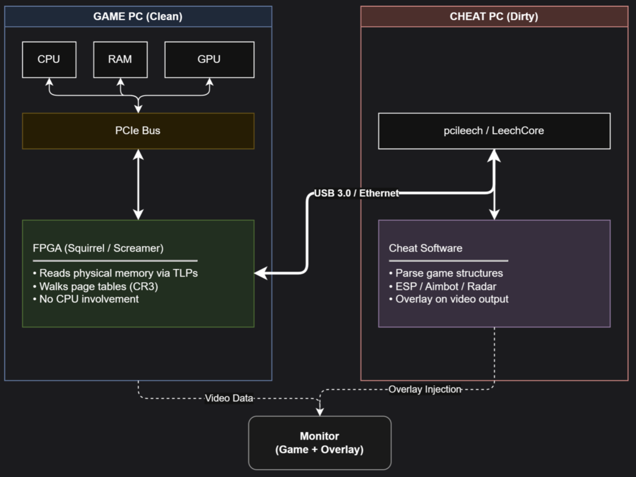 The escalation has been relentless. Usermode cheats gave way to kernel cheats. Kernel anti-cheats appeared in response. Cheat developers began exploiting legitimate, signed drivers with vulnerabilities to achieve kernel execution without loading an unsigned driver (the BYOVD attack). Anti-cheats responded with blocklists and stricter driver enumeration. Cheat developers moved to hypervisors, running below the kernel and virtualizing the entire OS. Anti-cheats added hypervisor detection. Cheat developers began using PCIe DMA devices to read game memory directly through hardware without ever touching the OS at all. The response to that is still being developed.