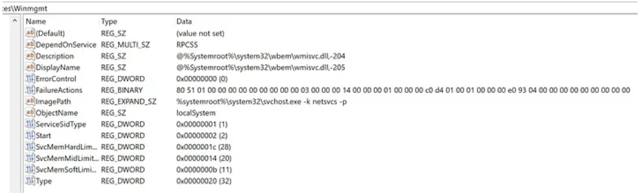 The WMI service (WinMgmt) is stored within wmisvc.dll which is loaded and runs inside of svchost.exe. We can see this if we look at WinMgmt configuration within the registry: