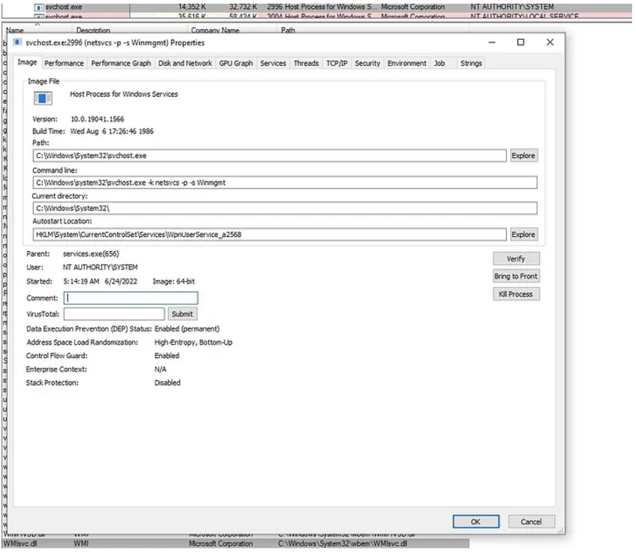 - WMI service (wmisvc.dll) is launched within the SVCHOST process via (C:\Windows\system32\svchost.exe -k netsvcs -p -s Winmgmt)