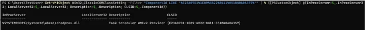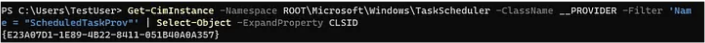The following command will call the TaskScheduler namespace to filter through provider names. Once it matches ScheduledTaskProv it will print out a GUID value. This is the CLSID that will point us to the appropriate binary of the WMI Provider.