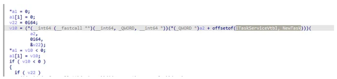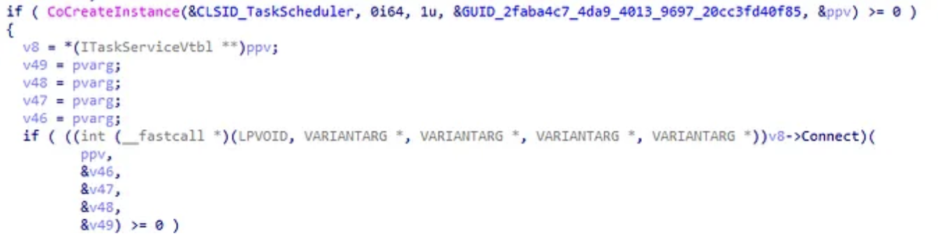 PPV and var_218 hold the same memory location. We see var_218 being dereferenced twice and then an offset of 50h is called. This offset relates to what COM method is being invoked within the ITaskService interface.