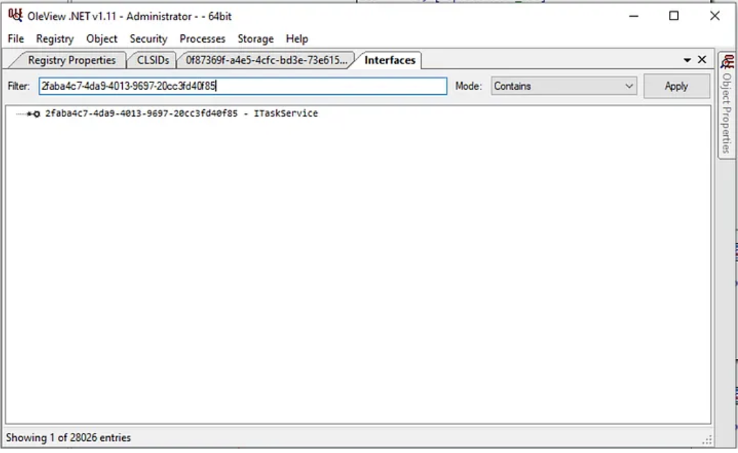 If we look, IDA filled in the CLSID (CLSID_TaskScheduler — 0F87369F-A4E5–4CFC-BD3E-73E6154572DD) value with the proper symbols. Next, we see the GUID that represents which COM Interface this action comes from. Using OleViewDotNet we can see this value corresponds to ITaskService.