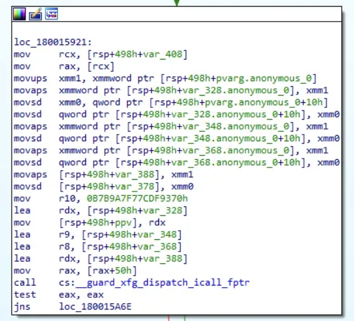Lastly, if we want to find what COM methods we want to invoke we have to follow ppv. On the assumption that CoCreateInstance was successful another code block is jumped into which contains the code below. If we follow the code from earlier we see that certain offsets of ppv get called, which leads me to believe after applying the right structure we should be able to see which methods are being invoked. A decompiled and assembly example are shown below.