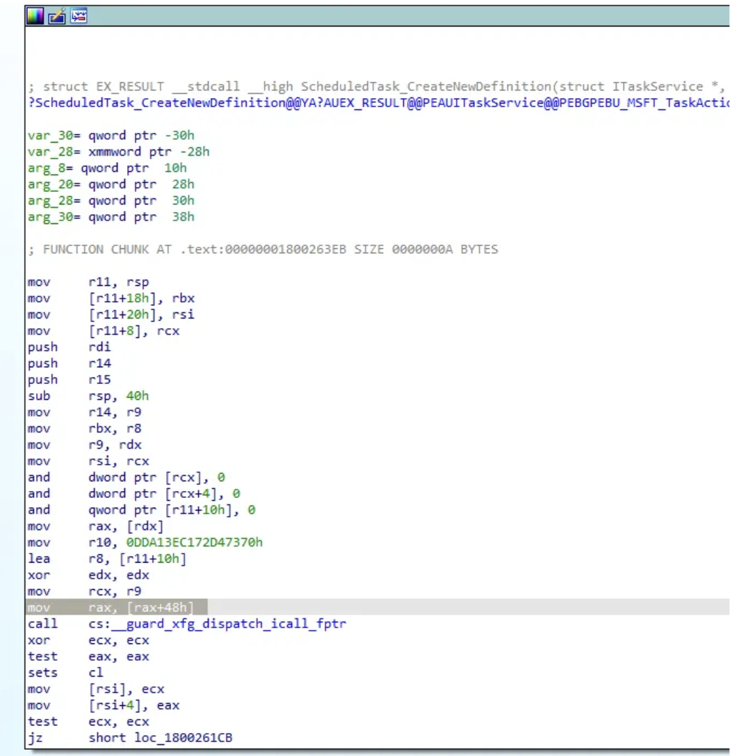 As we can see, there is an immediate jump to another function calledScheduledTask_Invoke_RegisterByUser. After looking at this function block, we see a section that calls CoCreateInstance.
