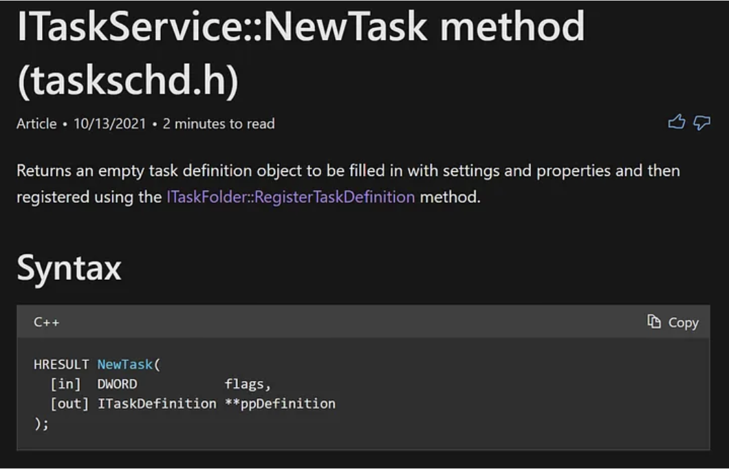 After googling for ITaskService::NewTask, I was able to identify this Microsoft document that outlines this COM method:
