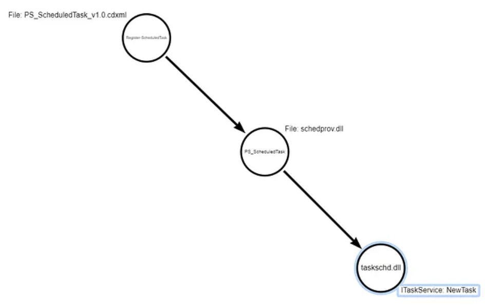 After applying binary analysis to the WMI Provider binary (schedprov.dll) we were able to identify that the WMI class PS_ScheduledTask ends up invoking the COM method NewTask::ITaskService. The flow of functions we encountered today can be seen below: