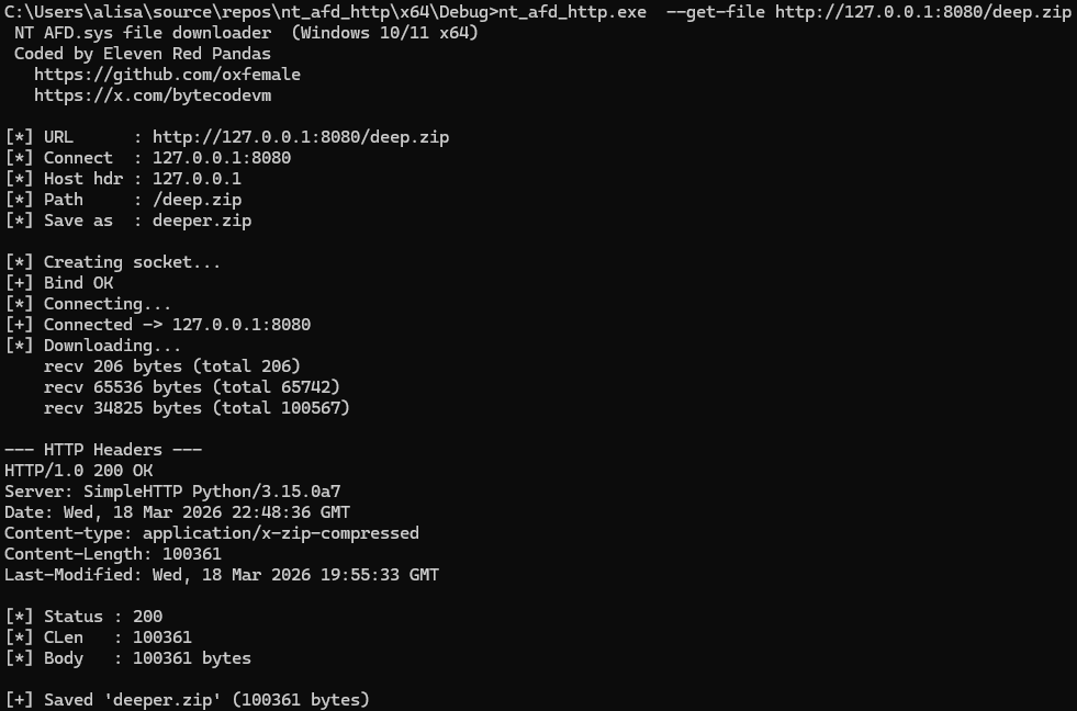 This article documents the development of an HTTP file downloader in C++ that operates completely bypassing the standard Winsock API. Instead of the familiar socket(), connect(), send(), recv() from ws2_32.dll, we talk directly to a Windows kernel driver through the NT Native API interface.