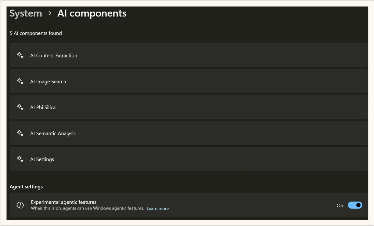 Odr.exe ships with the latest, at the time of this blog post, Dev and Beta Insider Preview channels. However, all the functionality which ODR leverages must be enabled through the Experimental agentic features setting in System > AI components.