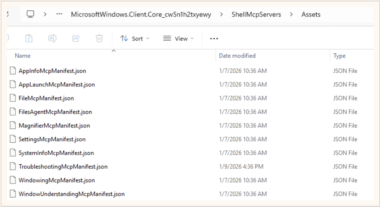 This toggle enables the various features, gated by numerous feature flags, on the operating system. Odr.exe is accessible in the %PATH% environmental variable on Windows, and is accessible as a command line tool. The full path to Odr.exe is C:\Windows\SystemApps\MicrosoftWindows.Client.CBS_cw5n1h2txyewy. However, C:\Windows\SystemApps\MicrosoftWindows.Client.Core_cw5n1h2txyewy\ShellMcpServers\Assetscontains all the various default/built-in MCP server JSON configuration files (MCPB) demonstrated by the Microsoft documentation. This does not include the MCP servers explicitly registered with ODR.
